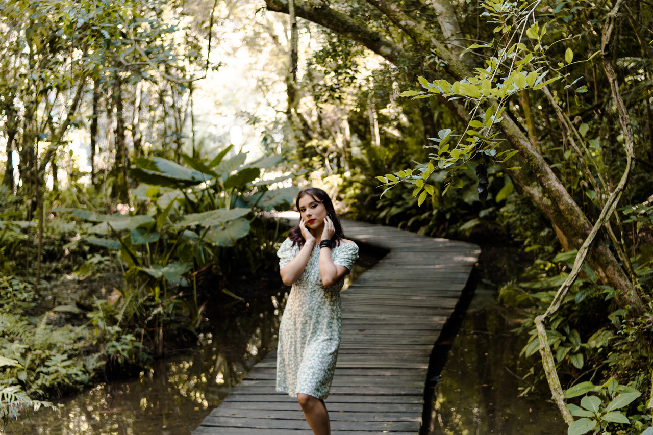 Para contrastar com o verde da natureza, cores que ficam incríveis para usar no ensaio feminino externo são: branco, bege, tons pastéis e tons terrosos (como amarelo queimado, marrom...).